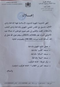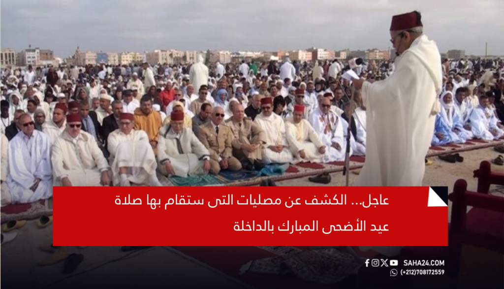 أعلنت المندوبية الإقليمية للشؤون الإسلامية بمدينة بالداخلة عن ترتيبات صلاة عيد الأضحى المبارك لعام 1446هـ/2025م، والتي ستقام ابتداء من الساعة الثامنة صباحا (08:00)، بالإضافة إلى عدة مساجد تم تخصيصها لاستقبال المصلين في مختلف أحياء المدينة.
