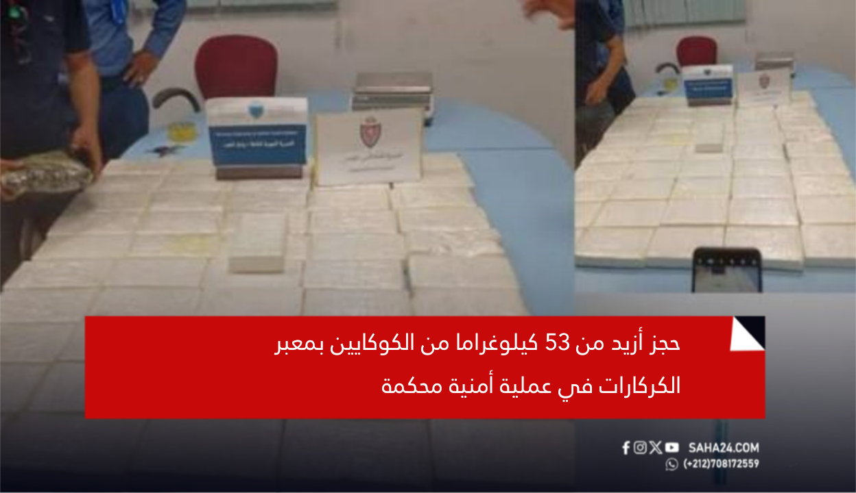 في عملية أمنية مشتركة بين عناصر الأمن الوطني والجمارك، تم مساء أمس بمعبر الكركارات الحدودي جنوب مدينة الداخلة، حجز 53 كيلوغراما و630 غراما من مخدر الكوكايين.